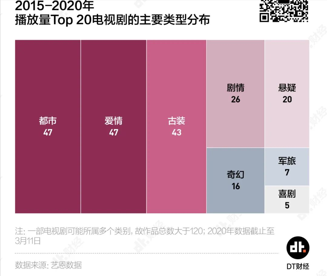 虽然作品数量不占优势,但并不意味着职场剧没有市场。相反,在不少投资人眼中,职场题材反而是他们乐于投资的一类作品。这主要从两大维度来看,首先是都市剧题材的创作数量,艺恩数据显示,2015-2020期间,播放量数据最高的作品题材,都市和爱情类题材占据高位,这意味着都市偶像剧拥有大量受众需求。