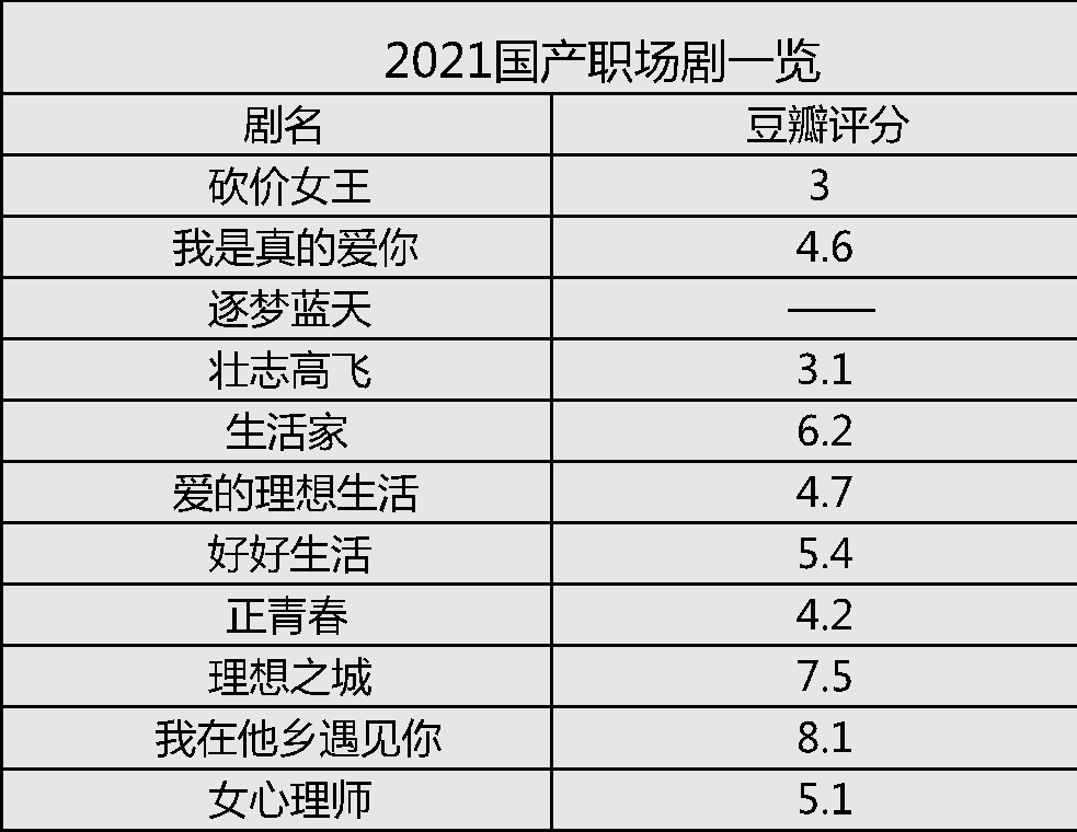 以今年为例,据不完全统计,今年的都市职场剧题材有且仅有11部,这还是包含了《我在他乡挺好的》《爱的理想生活》《正青春》这样的“泛职场题材”,可见这类型作品的稀缺性。
