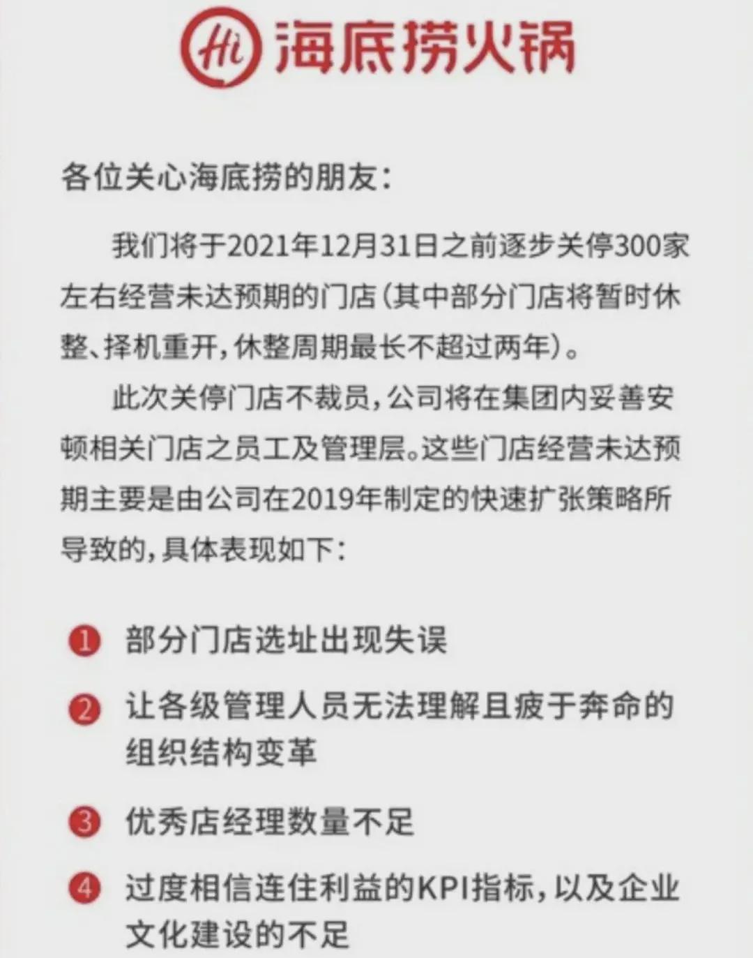 2021年2月,海底捞的股价一度高达85.75港元,最高市值4544.75亿港元,时至6月,股价出现断崖式下跌,市值蒸发超2500亿港元。11月,海底捞宣布关闭300家门店,令外界哗然。