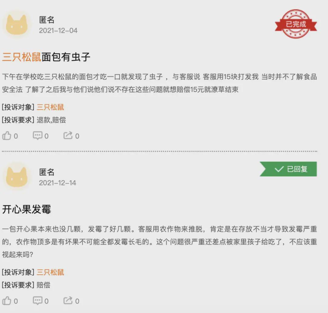在此之前,网红零食品牌“三只松鼠”也被曝存在变质、发霉等情况。在黑猫投诉平台上,三只松鼠、良品铺子、百草味等零食品牌,都有超1000条投诉,内容大多与食品中有异物、异味等质量问题有关。