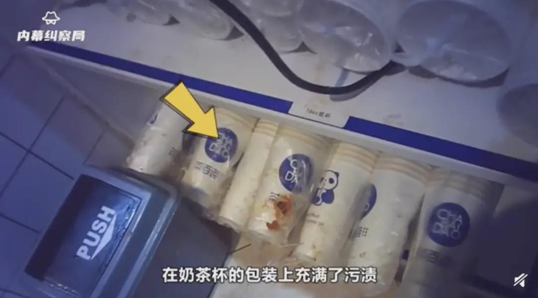 博主“内幕纠察局”暗访茶百道,发现奶茶杯包装充满污渍 来源 / 微博视频截图