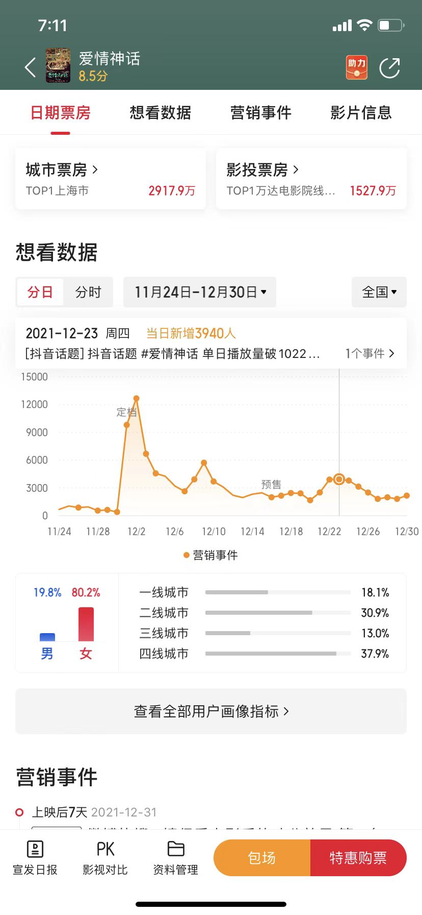 由此也造就了《爱情神话》在票房结构上的奇观:截至今日,其总票房为1.20亿,而上海一个城市的票房就高达2917.9万,占比超过25%,成为第一大票仓,可谓前所未有。