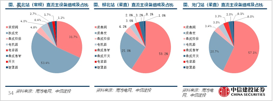 ▲昆柳龙工程常规换流站和柔直换流站设备组成占比,数据来源:中信建投