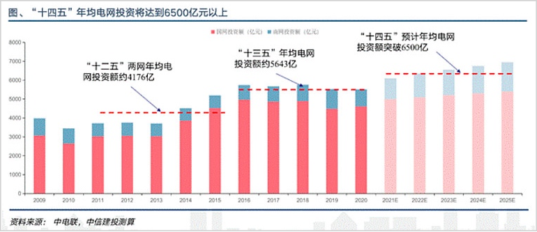 国家电网公司董事长辛保安此前披露,“十四五”期间国家电网计划投入3500亿美元(约2.23万亿元),推进电网转型升级。