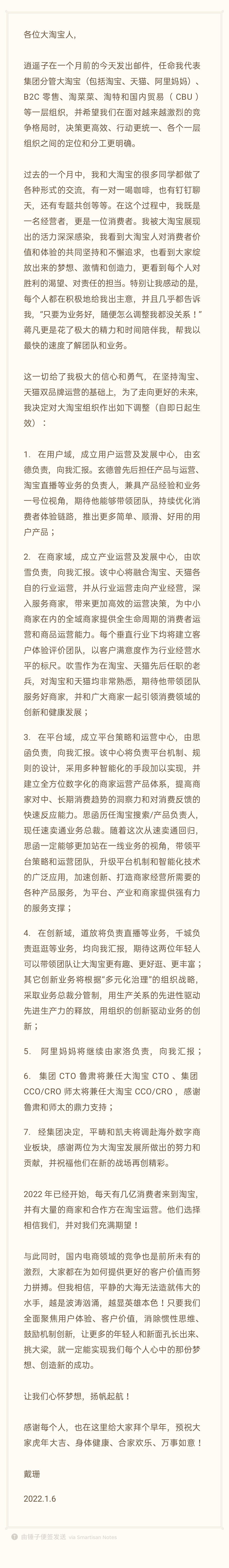 昨日,戴珊发布内部信,宣布阿里中国数字商业板块进行新一轮组织架构调整,调整重点是淘宝和天猫融为一体。