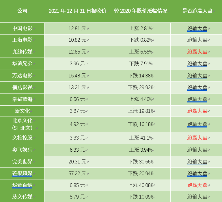 而相比电影公司明显的迭代,电视剧公司则出现了极大的反差。一直以来作为电视剧公司中的常胜将军的完美世界、芒果超媒没能跑赢大盘,股价同比2020年年末大幅下跌,而华录百纳、华策影视等老牌公司,则保持着了股价增长态势。