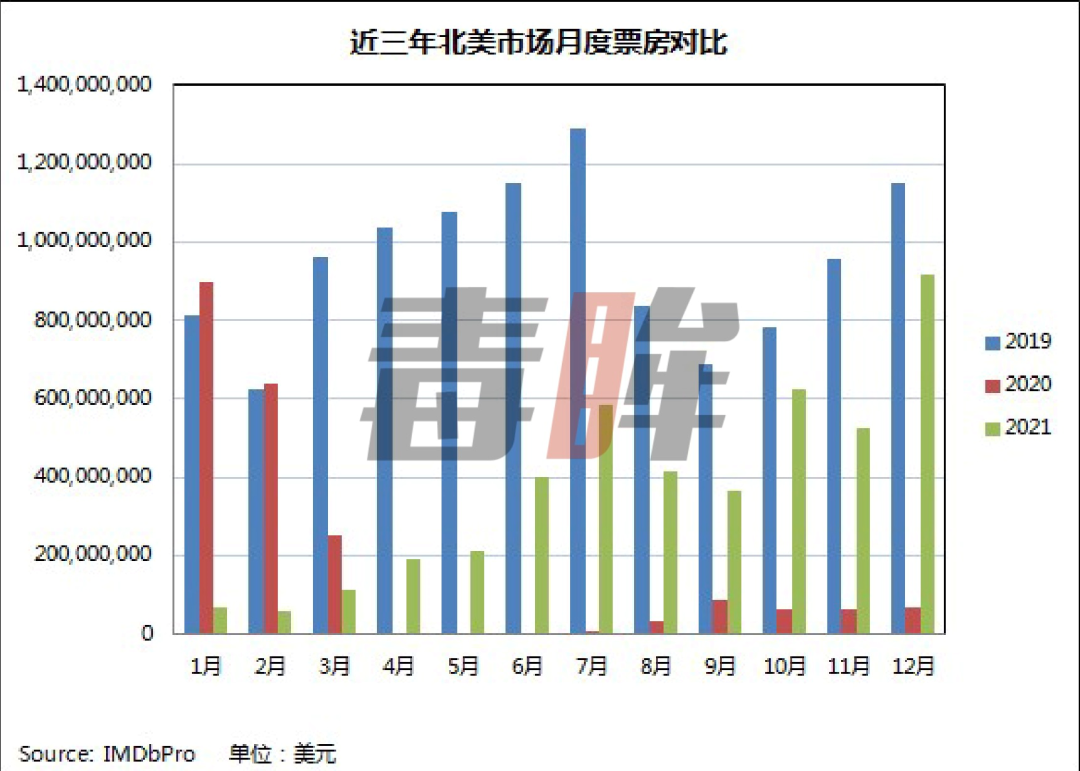 据IMDbPro统计,2021年北美全年票房定格于44.69亿美元,同比2020年的21.03亿美元回升112.5%。当然,与两年前的113.2亿美元相比,2021年仅恢复至四成左右,距离巅峰期仍相距甚远。