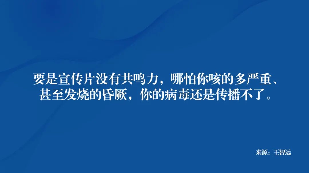 讲究能否像病毒一样被用户传播分享社群,要是宣传片没有共鸣力,哪怕你咳的多严重、发烧的昏厥,你的病毒还是传播不了。