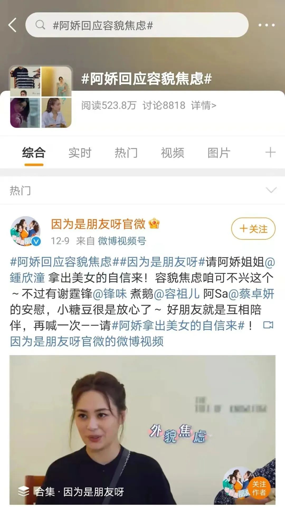 而就在前不久,一档聚集了Twins、容祖儿、谢霆锋的闺蜜旅行综艺《因为是朋友呀》在抖音上线。节目主打“糖三角姐妹花”之间的友情,曾因为 #阿娇回应容貌焦虑# 的话题一度上过热搜。
