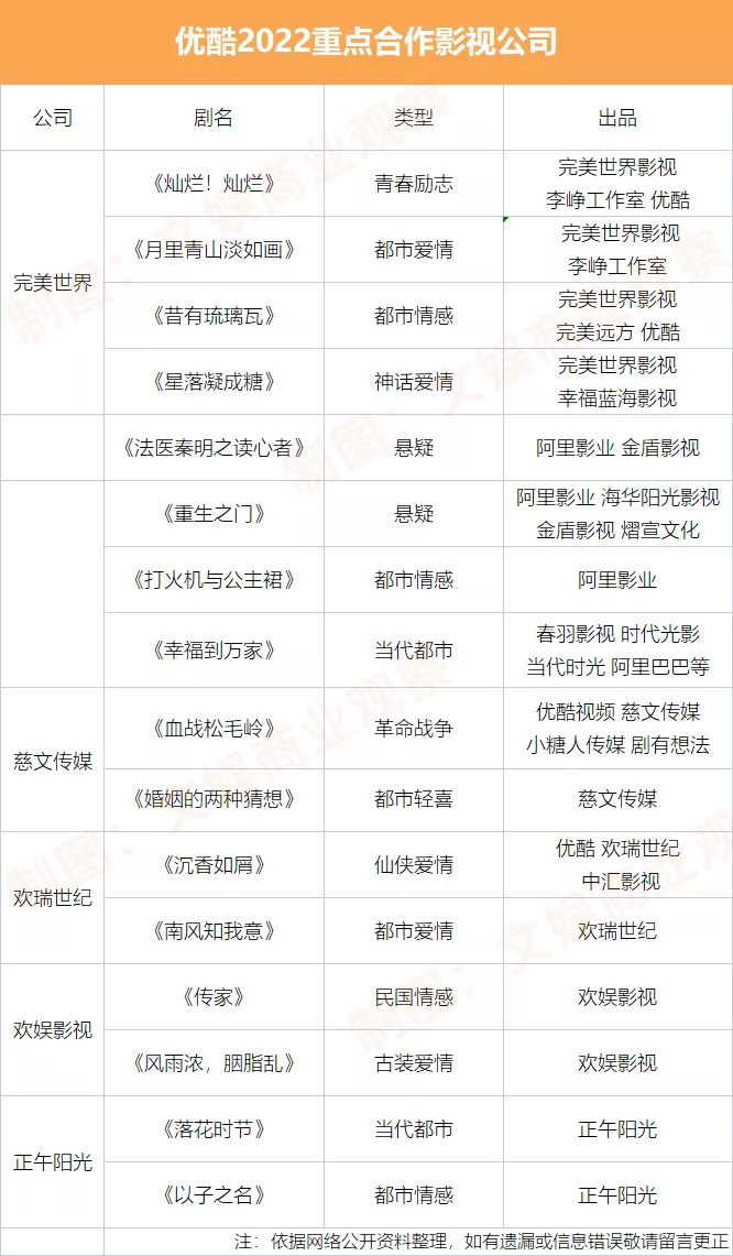 优酷今年主要合作对象中的完美世界、慈文传媒、欢瑞世纪都是与其合作产出过热作的,今年筹备的项目也基本为以往合作的惯常类型,只有慈文传媒改变相对较大,出现了一部革命战争题材《血战松毛岭》。