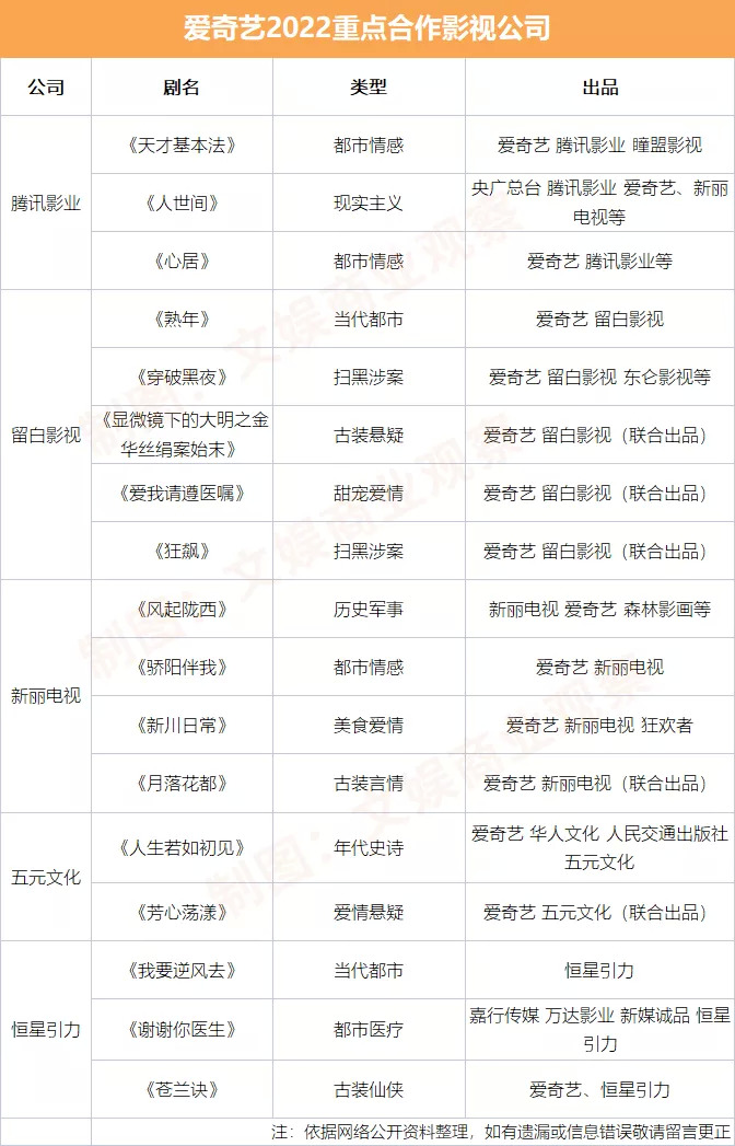 综合来看,爱奇艺今年的合作对象选择依旧是广泛、平均,并给予了国韵文化、么么影视等更多新兴公司重要机会。