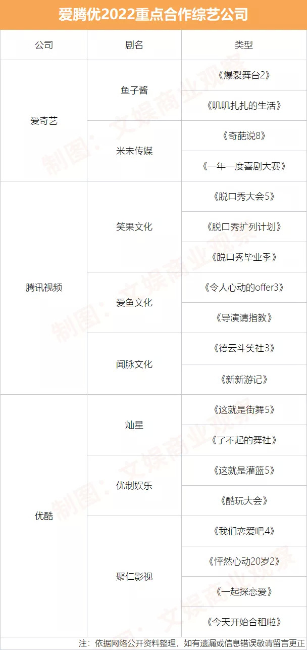 爱腾优2022年最亲密的合作伙伴还是鱼子酱、米未传媒、笑果文化、闻脉文化、灿星制作、优制娱乐等。