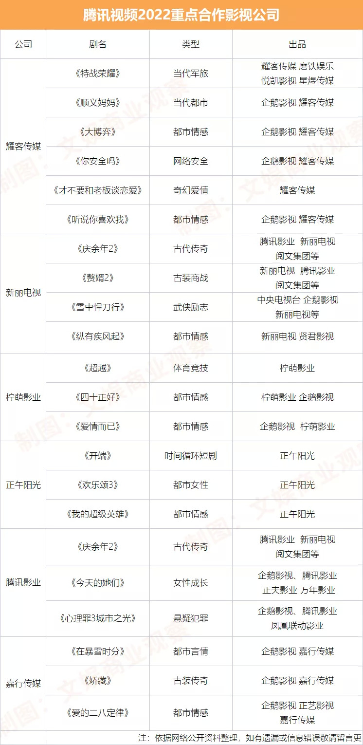 腾讯影业、留白影视、新丽电视、恒星引力、五元文化等
