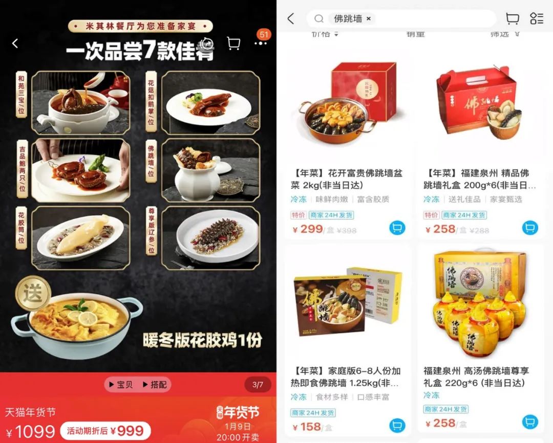现阶段看起来最有可能C位出道的是佛跳墙。淘宝发布的年夜饭菜单中,佛跳墙连续三年稳居高位,这款以工序复杂、食材丰富、烹饪耗时闻名的“闽菜之王”,毫不夸张地说,已经在预制菜浪潮中泛滥成灾,从拼多多到淘宝,从8.8元到468元,佛跳墙几乎成了年夜饭中的硬通货。