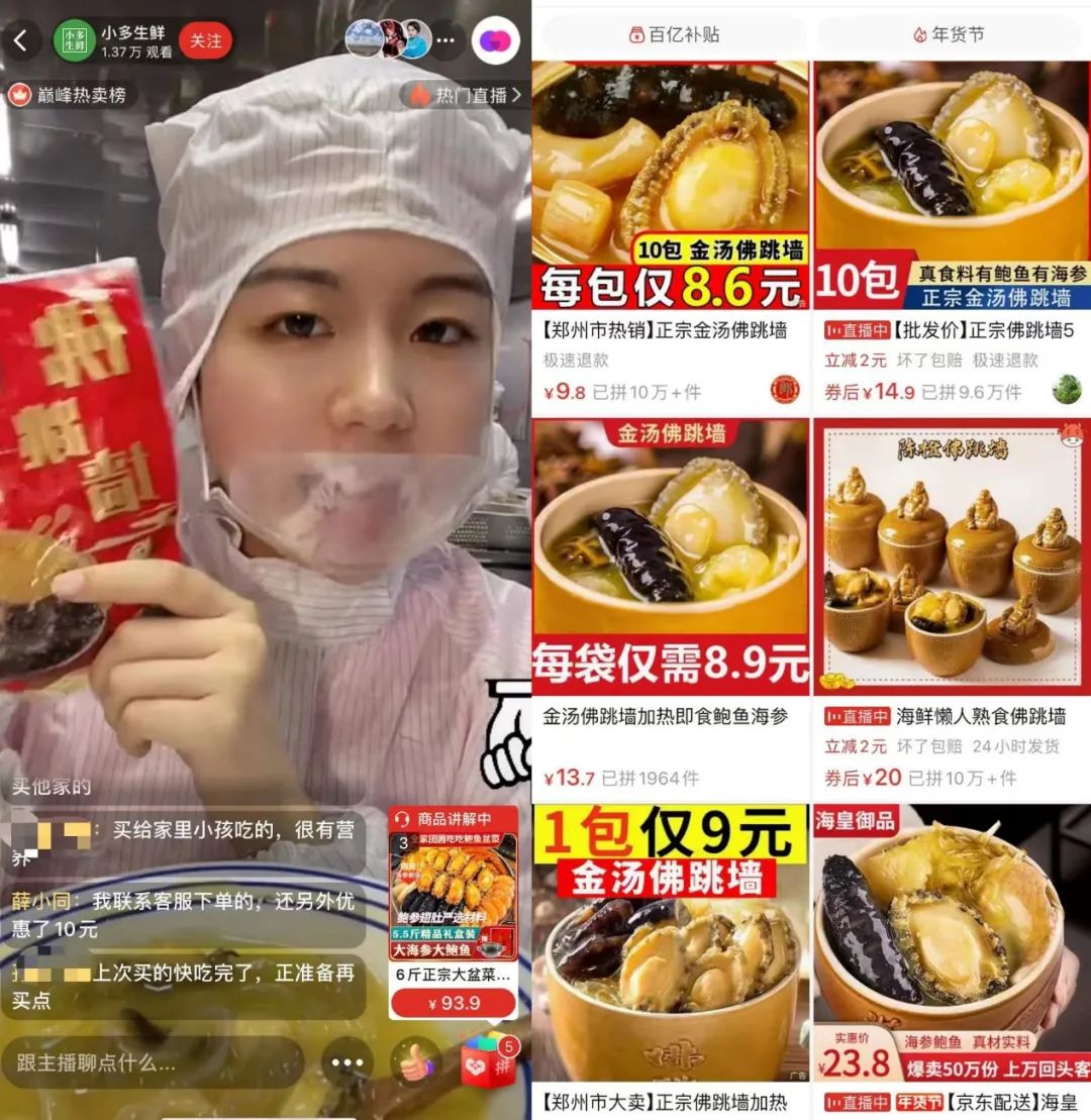 多看几分钟就能发现,所谓直播不过是3分钟的录播视频轮播,而均价不到20块钱一袋的佛跳墙在拼多多上更是随处可见,就算没有直播间,产品卖到10万+也很常见。