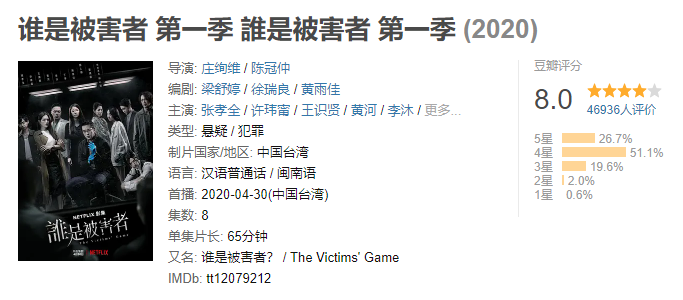上一部评分达到8分的奈飞中文剧,还是2020年5月上映的《谁是被害者》。该剧同样是系列类剧集,第二部的首播时间是2022年。