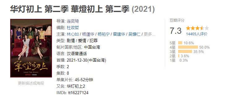 2021年12月30日,《华灯初上》第二部在奈飞播出,和奈飞一贯的风格一样,8集在开播当日全部上线,开播后连续四天位列收视率第一。