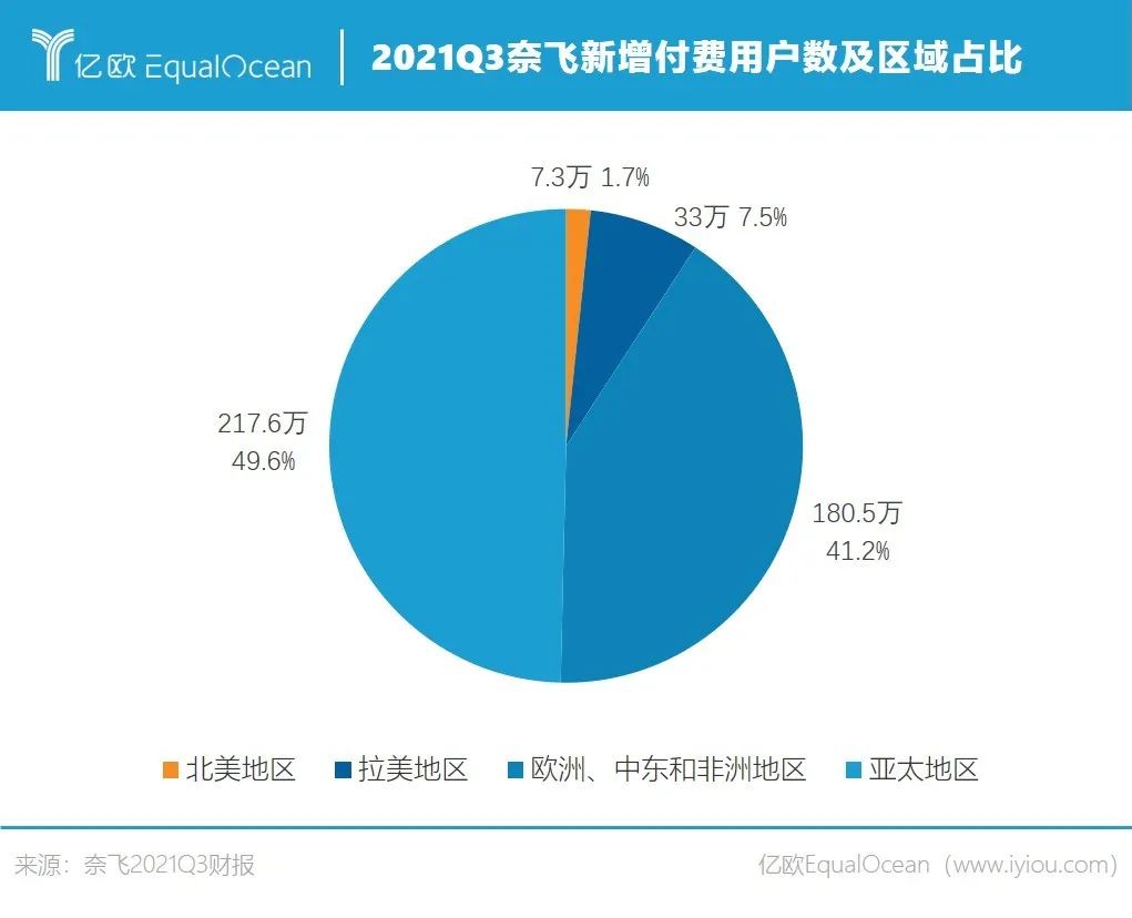 财报显示,早在2017年第三季度,奈飞的国际付费用户数就已超过美国付费用户数;截至2021年第三季度末,全球流媒体付费用户总数已经达到2.14亿。仅2021年第三季度净新增的付费用户数就有438.4万,同比翻倍;其中,北美地区新增用户数7.3万,欧洲、中东和非洲地区新增用户数180.5万,拉美地区新增用户数33万,亚太地区新增用户数217.6万。