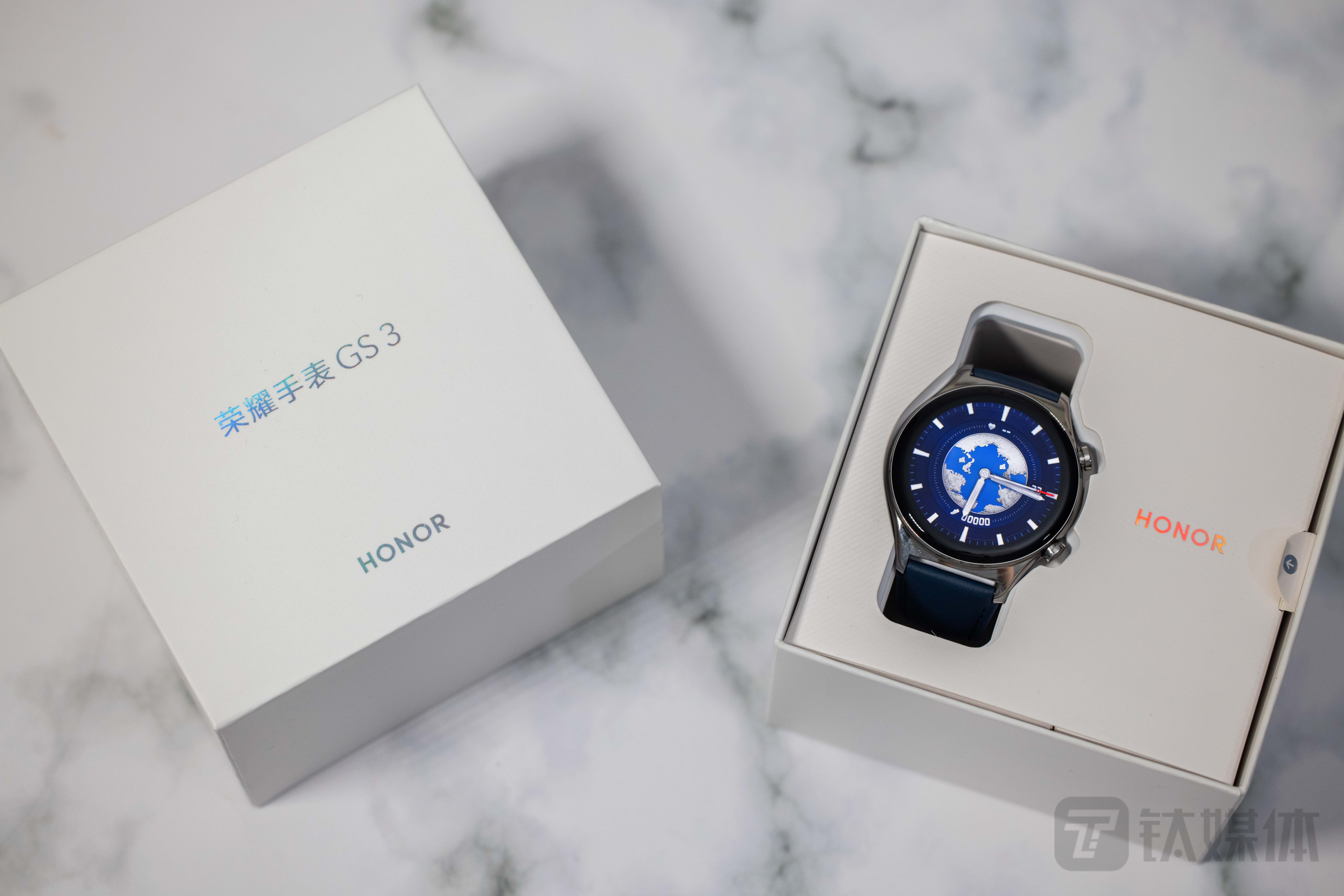 钛媒体App拿到的是环球远航主题版本的荣耀手表GS 3。这款手表采用的是,金属材质的表壳,搭配蓝色Nappa头层小牛皮材质的表带。蓝色皮带设计,搭配初始状态下“潜航时代”的表盘,整体海洋风格十足,十分贴合“环球远航”这一款式主题。