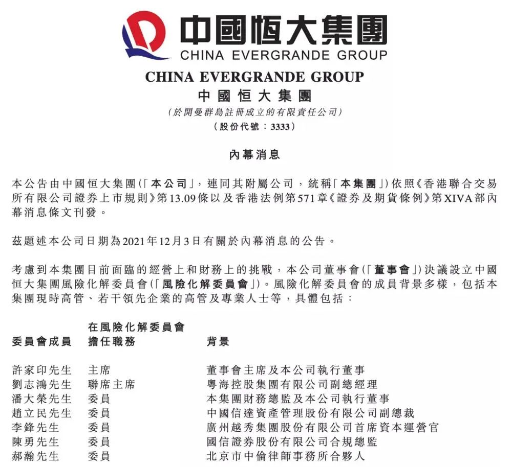 3 天后,恒大宣布设立“中国恒大集团风险化解委员会”,七名成员分别来自恒大现任高管、地方国资企业、资产证券公司及律师事务所,许家印担任委员会主席。