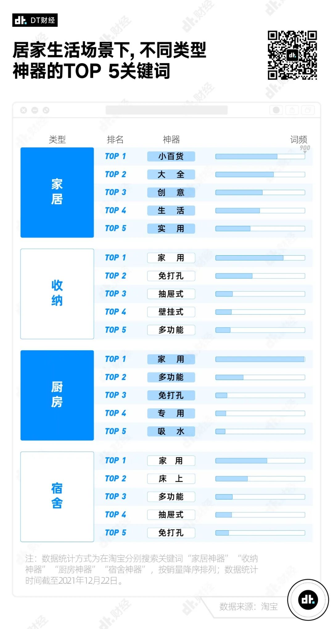 另一方面,“多功能”“大全”“小百货”这些关键词表明,大家都希望神器能“一物多用”,变相提高物品的性价比。