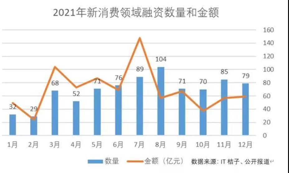 从融资数量和融资金额来看,2021年的7-8月是一道分水岭,继高峰之后,新消费的融资金额和融资数量都呈下降趋势。