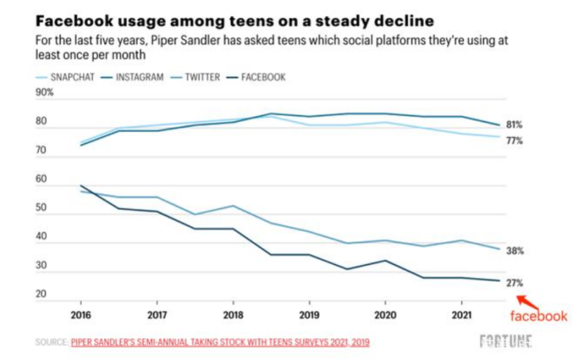通过社交软件起家的Facebook,是过去风口的催生者。但现在,老气横秋的Facebook正在丢失年轻用户。皮卡数据中心的一项研究显示,13-17岁的青少年使用Facebook的比例正在逐年降低,取而代之的是Snapchat、instagram等更为新潮的软件。