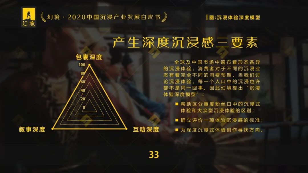 为了解决这个问题,幻境提出了一个“沉浸体验深度模型”。在这个模型中,幻境将参与者的体验分成三个维度:(感官)包裹深度、互动深度和叙事深度。