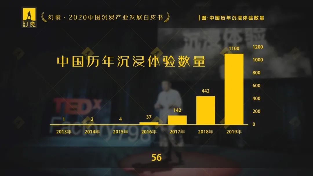 “沉浸”成为了文化消费的关键词。有了政策文件和背书后,沉浸越来越受到项目方的关注。2019年,沉浸产业迎来项目井喷——据幻境统计,2019年中国的沉浸项目数量达到1100个,比2018年增长近150%。