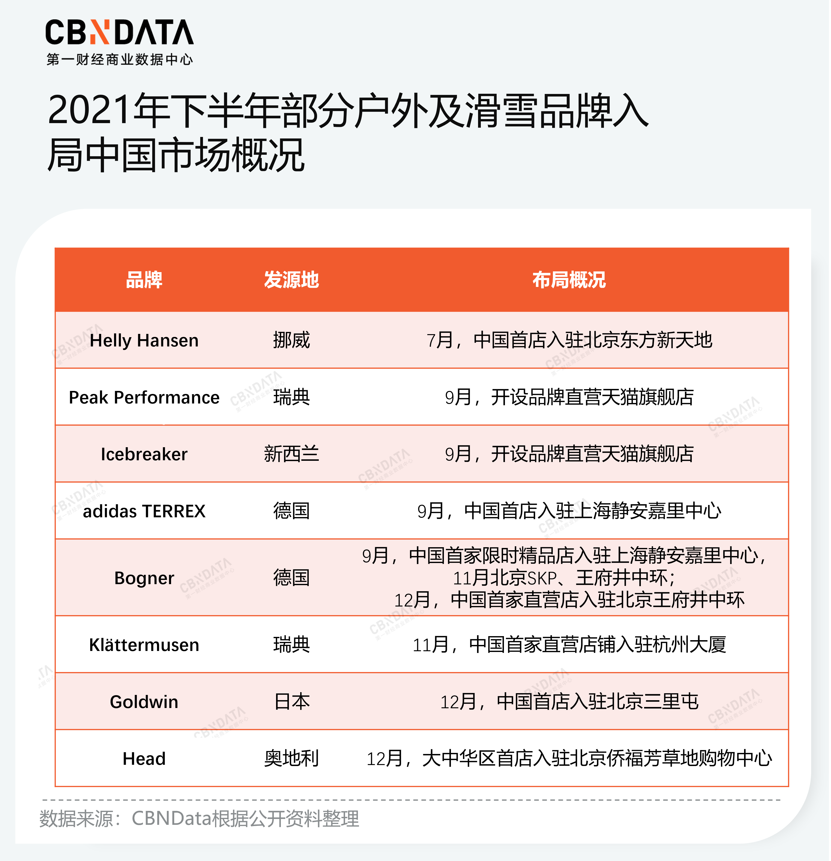 国内品牌以外,随着冬奥会的临近,拥有滑雪“基因”的国际专业户外运动及滑雪品牌也掀起了一股“入华潮”。据CBNData消费站(下称C站)不完全统计,仅在2021年下半年,就有近十个专业户外运动及滑雪品牌在中国开出首家门店,其中瑞典户外运动品牌的Peak Performance和VF集团旗下的新西兰品牌Icebreaker开设了品牌直营的天猫旗舰店,拥有超140年历史的挪威品牌Helly Hansen、adidas旗下专业户外运动品牌adidas TERREX等品牌先后开始布局中国市场。被誉为“滑雪服饰中的Dior”的Bogner更是动作频频,除了在上海静安嘉里中心和北京SKP先后开启了限时精品店外,还在年末与波司登共同成立合资公司共同运营中国市场的业务后,将中国首家直营店铺落户在了北京王府井中环。