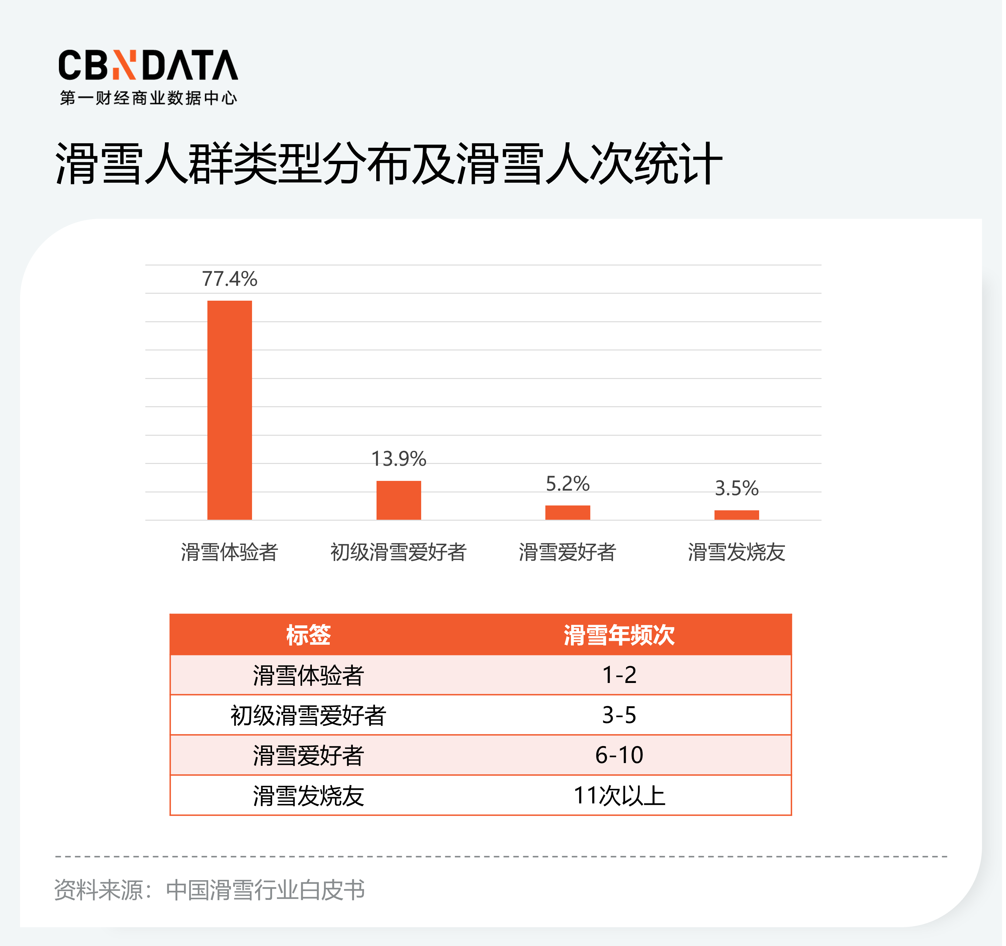 此外,我国的滑雪人群主要是滑雪体验者为主,这很大程度上会影响到对滑雪装备的消费。根据《中国滑雪市场白皮书》,我国的滑雪人群中,滑雪体验者占比高达77.4%,而其中滑雪次数达到11次以上,能被称作滑雪“发烧友”的人群仅有3.5%。