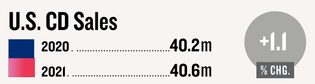 除了位于榜首的《30》之外,美国CD形式销量前十的专辑,与2020年的前十名相比,也都有着较为明显的增长。可见,1.1%的销售增长率背后,是CD市场的普遍“回潮”趋势。