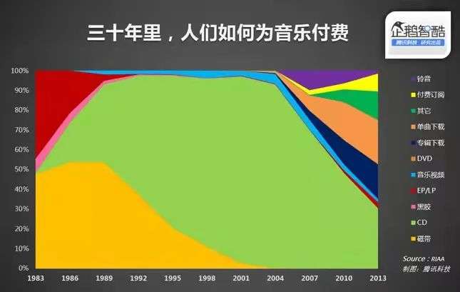 从2014年RIAA的数据可以看出,在经历了2001年94.5%的高点之后,2013年CD唱片在美国市场的份额已不足30%。到了2019年,实体音乐的市场占有率更是跌至9%,而在线音乐则超过了80%。