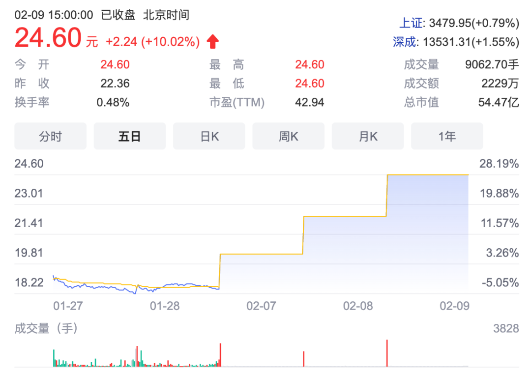 2月7日春节开市以来,被称为“冰墩墩第一股”的A股上市公司元隆雅图,接连收获3个涨停板。截至2月9日收盘,总市值已达54.47亿。