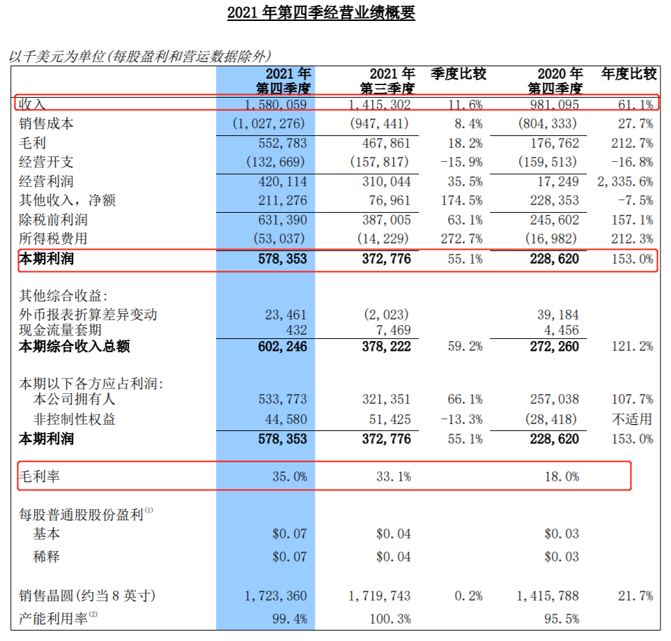 数据显示,四季度中芯国际销售收入为15.80亿美元,较第三季度的14.15亿美元增长11.6%,同比2020年第四季度的9.81亿美元则录得61.1%的显著增长。毛利率的表现更是令人惊喜,达到35%,较去年同期的18%几乎翻倍。