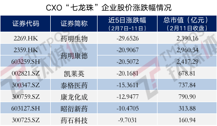容易引发恐慌的误传总会比真相更容易散播,因为国内大部分CXO企业都有全球化布局,药明生物的“遭遇”吓坏了CXO板块,一场持续数日的股价探底就此开始,包括药明生物在内,药明康德、康龙化成、泰格医药、凯莱英、昭衍新药、药石科技CXO“七龙珠”企业连跌4个交易日。