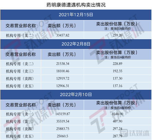 当此次“实体名单”恐慌在2月8日袭击CXO时,机构做出表态,盘后龙虎榜数据显示,当天4家机构专用席位净卖出6.55亿元药明康德股票。2月10日,盘后龙虎榜数据显示,4家机构专用席位净卖出22.96亿元药明康德股票。就在2021年的最后一个月,药明康德也曾登上龙虎榜,卖出前五名中有一席机构席位,该机构卖出3.34亿元药明康德股票。