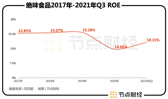 此外,2020年疫情之前,绝味食品的ROE(净资产收益率)都保持在20%以上,而到了2021年三季度时,其ROE恢复到18.15%。