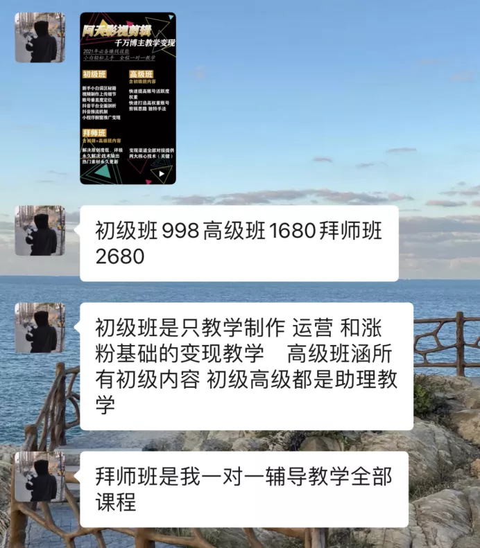 对于价格为何如此之高,阿天影视剪辑表示:“贵有贵的道理,我的涨粉速度你也看得到,我的学员反馈记录朋友圈也有,都是真实存在的,我学员的后期收益每个月都是拜师班的几倍。”