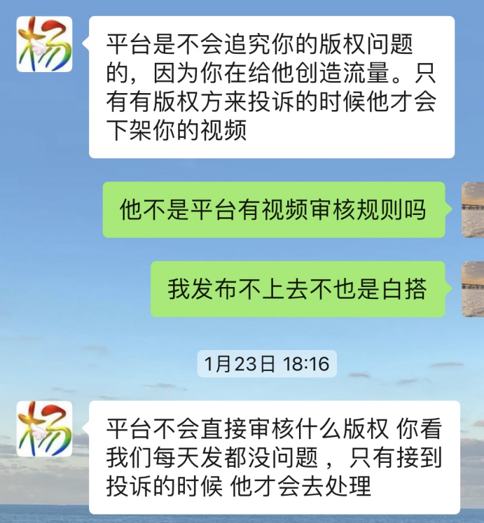 当问到《细则》对影视剪辑有无影响时,该博主则称:“我们一直都在做,没把那个协会当回事。而短视频平台是不会追究版权问题的,因为你在给他创造流量,只有版权方来投诉的时候平台才会下架你的视频。”