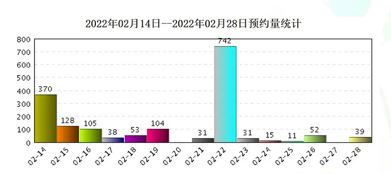 朝阳区,2月14日婚姻登记预约370对,而2月22日婚姻登记预约742对。