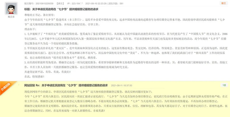 比如一位甘肃青年,为了推动民政局在恰逢周六的七夕节坚持营业,在留言中写到,他所在的地区是高价彩礼的“重灾区”,是中央新闻和国务院点过名的地方,这里面有婚育观念、男女比例、经济结构、性别观念、贫富差距等种种原因,正是因为这样,因此更需要政府相关部门,进行社会引导,改变这种陋习和不良风气,而弘扬中国传统文化中的“美好”,不失为一种选择。