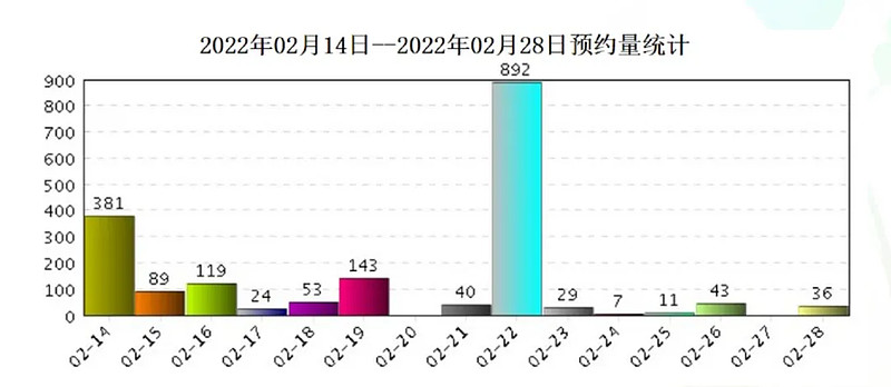 海淀区,2月14日婚姻登记预约381对,2月22日预约登记892对。