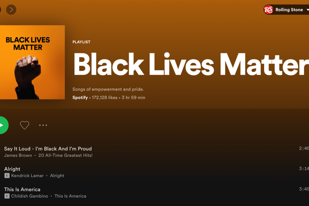 比如,2020年6月,为了抗议警察暴力和种族主义,纪念死于白人警察之手的乔治·弗洛伊。国外社交媒体上掀起了一场“Black Out Tuesday”活动,Spotify、Apple Music、Amazon Music和YouTube Music等主要音乐流媒体服务都通过暂停媒体服务、设置默哀时刻、建立基金会等方式加入了这场抗议活动。