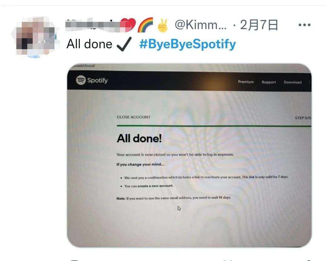 与此同时,社交媒体上有大量网友加入了#ByeByeSpotify#,分享他们取消Spotify账户的截图。