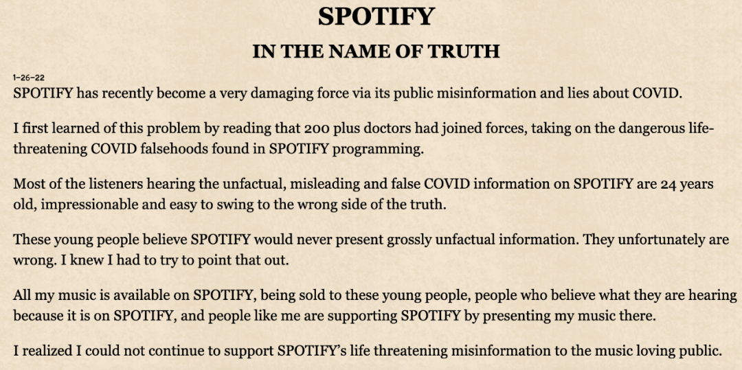 同时,“Spotify有责任减少在其平台上传播的错误信息,尽管该公司目前没有关于错误信息的处理政策。”Neil Young直指“Spotify已经成为威胁生命的COVID错误信息的发源地”,并呼吁“其他艺人和唱片公司离开Spotify平台”。