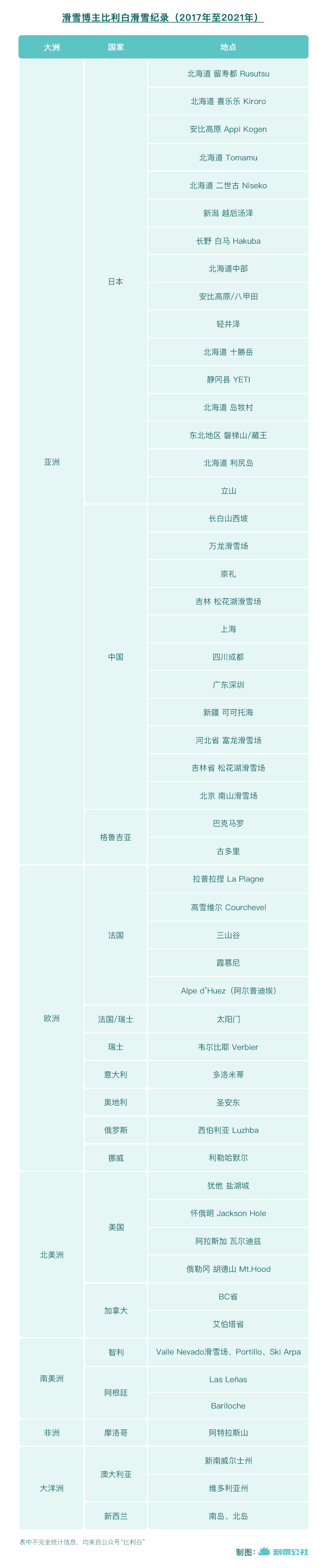 寻访中发现,比利白是滑雪经历最丰富的博主,在2017年至2021年期间,他至少去过16个国家的55个滑雪场。雪板在安第斯山脉与石头碰撞,也在日本北海道长野四月享受的温暖春雪。