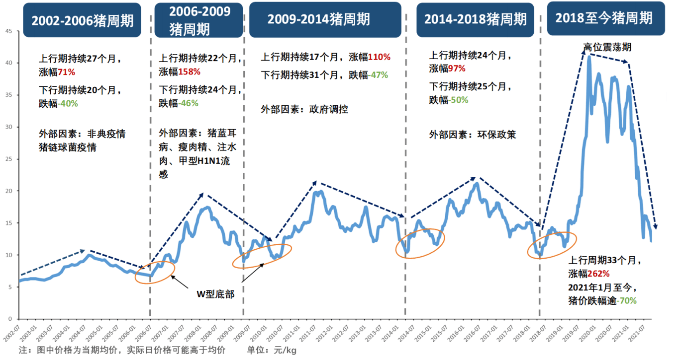 作为全球最大的猪肉消费国,中国的“猪周期”现象尤为明显,2000年以来已经连续上演了5轮猪周期:2002年到2006年、2006年到2009年、2009年到2014年、2014年到2018年,以及2018年至今的新一轮周期。正在按照三到四年的时间节点,一次次重复着涨跌的过程,甚至还将在接下来的一段时间里继续上演。