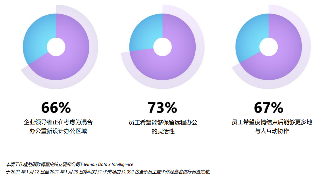 从当前形势来看,混合办公似乎是大势所趋,也是一股不可逆的潮流。根据微软发布的《2021年工作趋势指数报告》,有66%的企业领导者考虑为混合办公重新设计办公区域,还有73%的员工希望保留远程办公的灵活性。