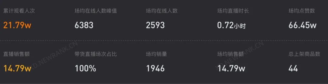 具体来看,自2021年12月28日开播起两周,东方甄选累计带货商品数97件;累计销售额127.91万元;累计销量1.92万件。